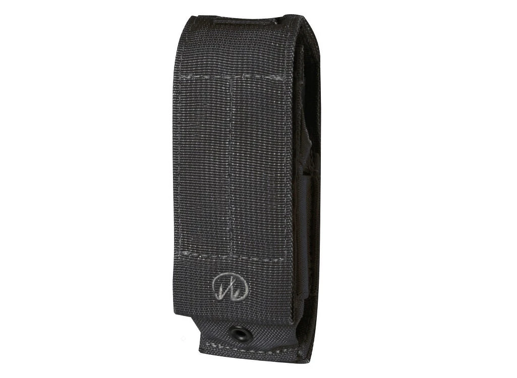 This large, nylon MOLLE system sheath features a snap webbing strap on the backside for attachment. This attachment webbing can also hold a MUT® accessory wrench. The sheath features a Leatherman logo, a Velcro front closure and an internal storage panel to hold extra bits.
