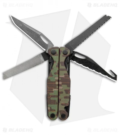 The Leatherman Charge Plus multi-tool is packed with 18 tools, including interchangeable wire cutters, drivers and 8 bits. The Charge Plus has stainless steel construction with hard anodized woodland camo 6061-T6 aluminum handle scales. It features a 2.9″ 154CM stainless steel blade with a plain cutting edge and a 2.9″ 420HC steel blade with a fully serrated edge and an integrated guthook. All blades and tools are locking. The Charge Plus multi tool includes removable pocket clip and a premium nylon sheath.