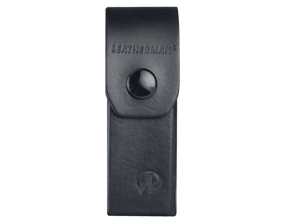 This leather belt sheath features the Leatherman name and logo with a snap closure.