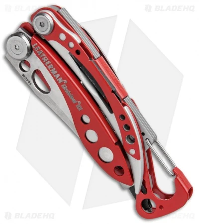The Skeletool CX features: DLC-coated stainless steel handles with a red finish; stainless steel body; outside-accessible blade for one-handed opening; all locking blades and tools; removable pocket clip; DLC coating for scratch and corrosion resistance; 25-year warranty.