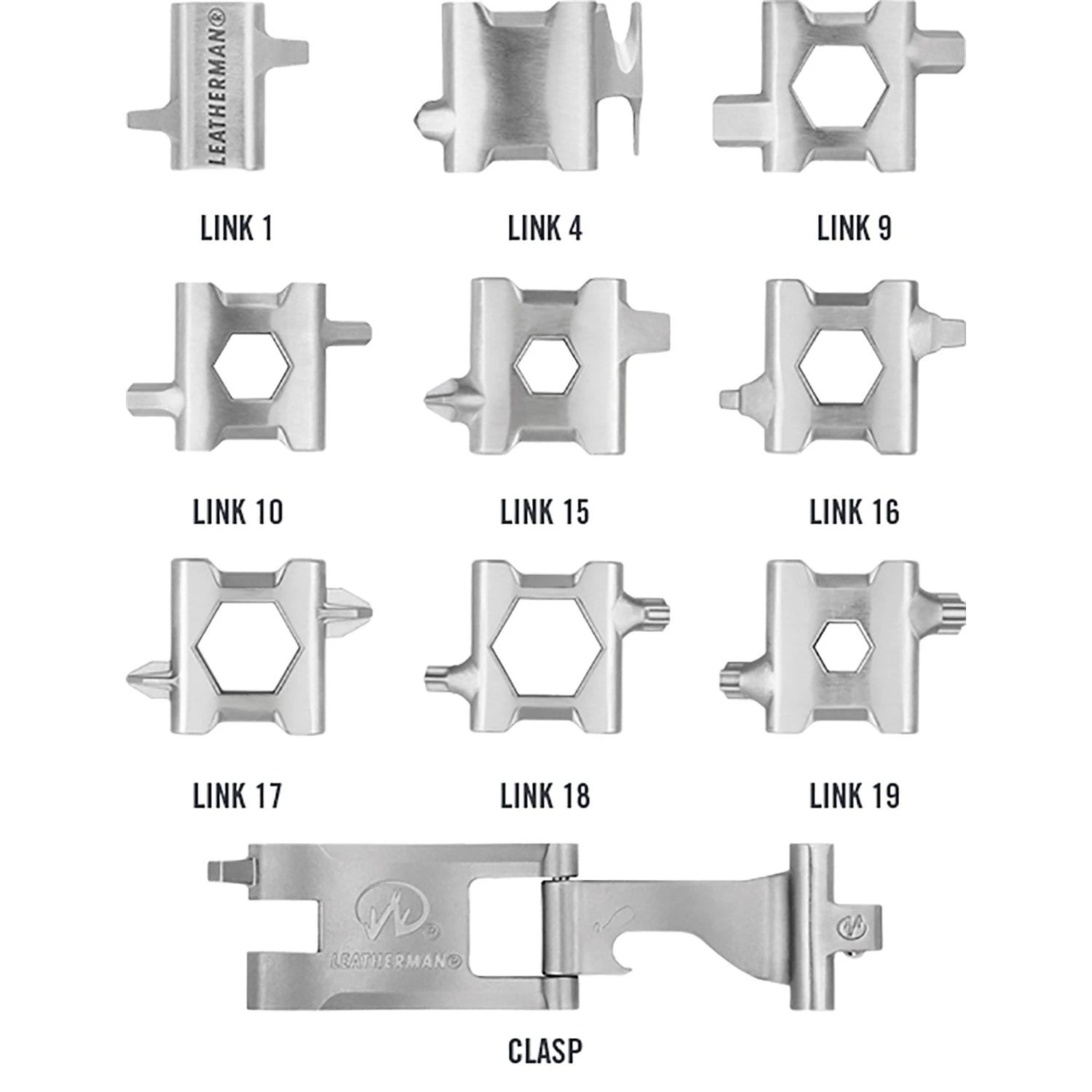 Le bracelet Leatherman est réglable au demi centimètre près, pour accueillir toutes les tailles de poignet, et chaque maillon unique dispose de plusieurs outils, même le fermoir comporte un embout ¼” et un décapsuleur.